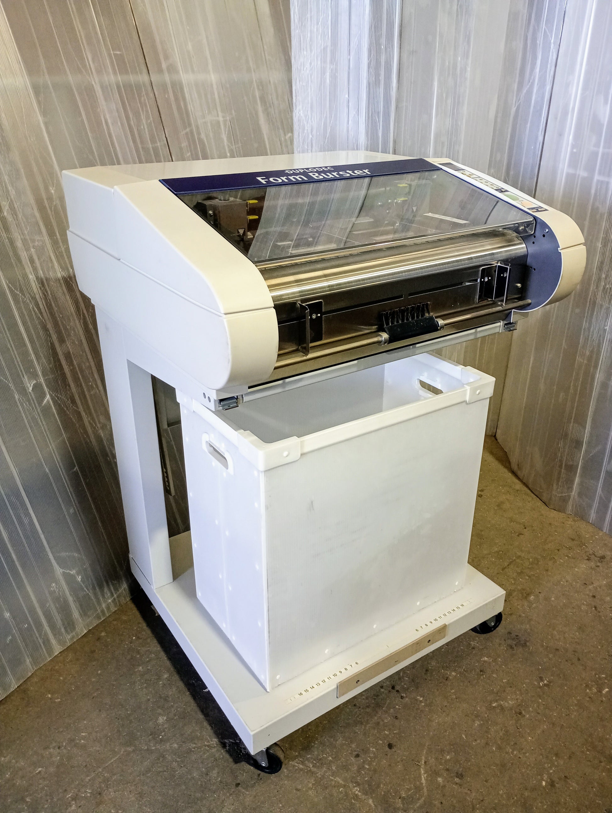 デュプロ製のバースターV-737は、ミシン目付き連続帳票や単票を自動で切り離す専用機です。ピントラクタ方式を採用し、最大90m/分の高速処理に対応。帳票処理の現場で、作業の効率化を実現します。
