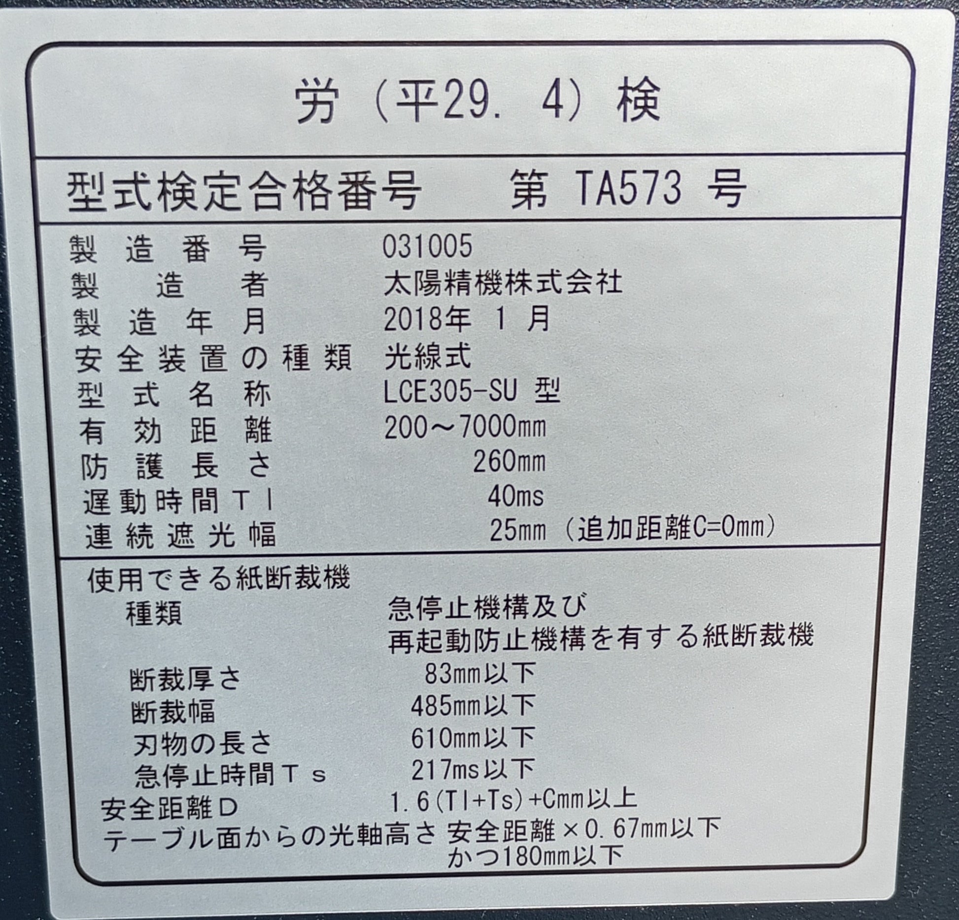 安全装置型式検定合格番号:第TA613号(APC480-SU 型)、第TA573号(LCE305-SU 型)