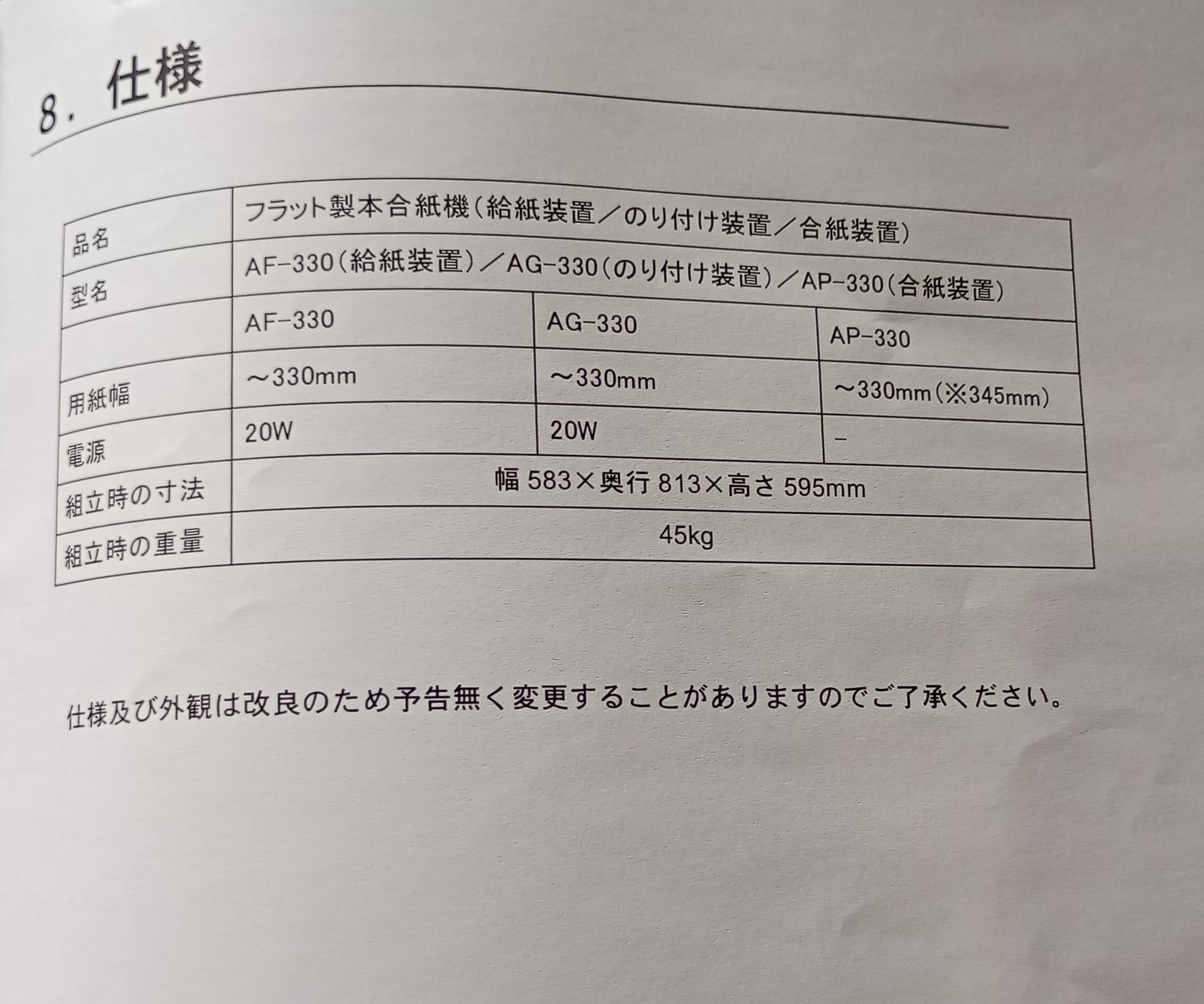 型式:AF-330(給紙装置)/AG-330(のり付け装置)/AP-330(合紙装置)