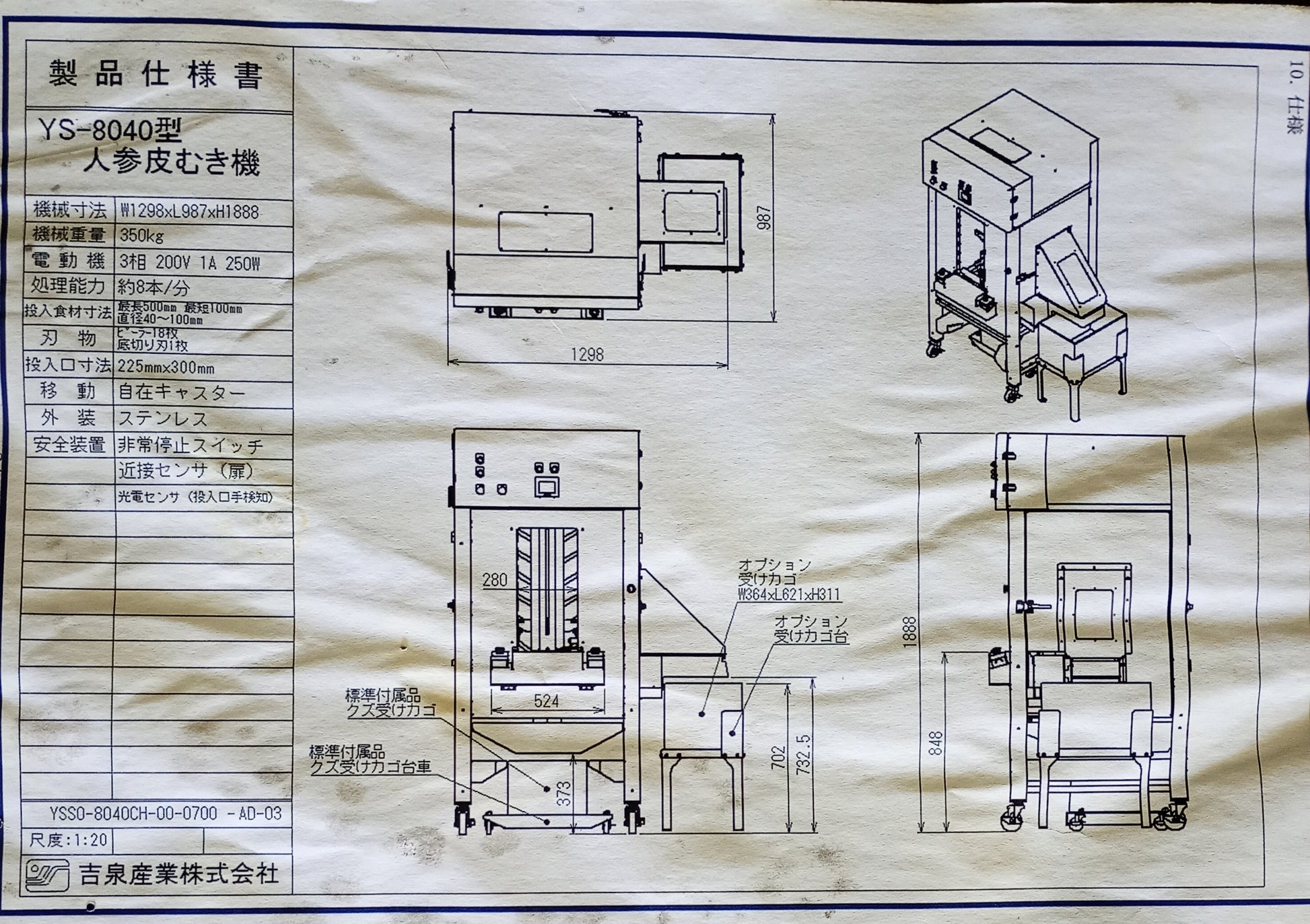 吉泉産業 YS-8040型 人参・大根兼用縦型皮むき機 自動皮剥き・ヘタ切断機能付き